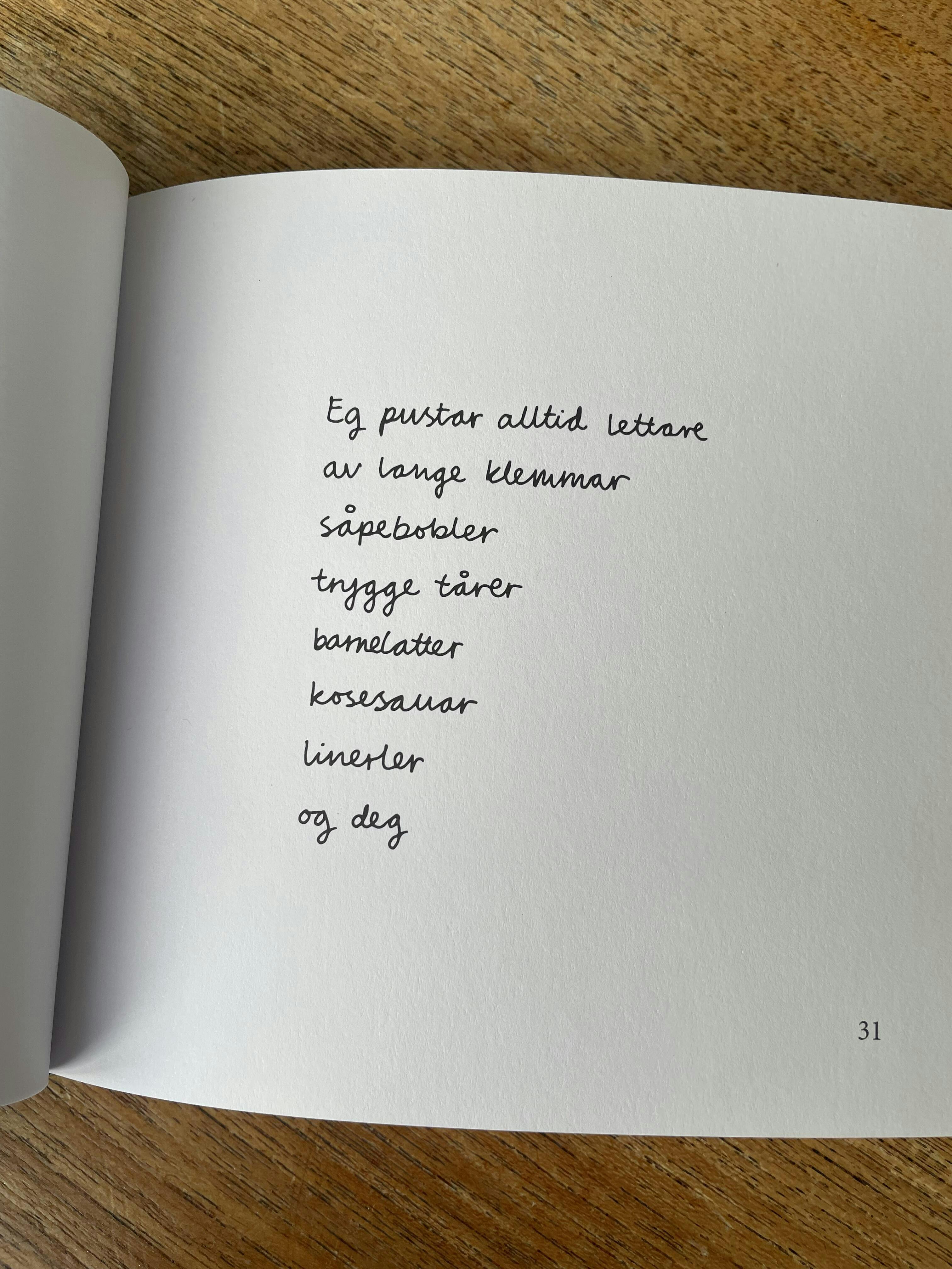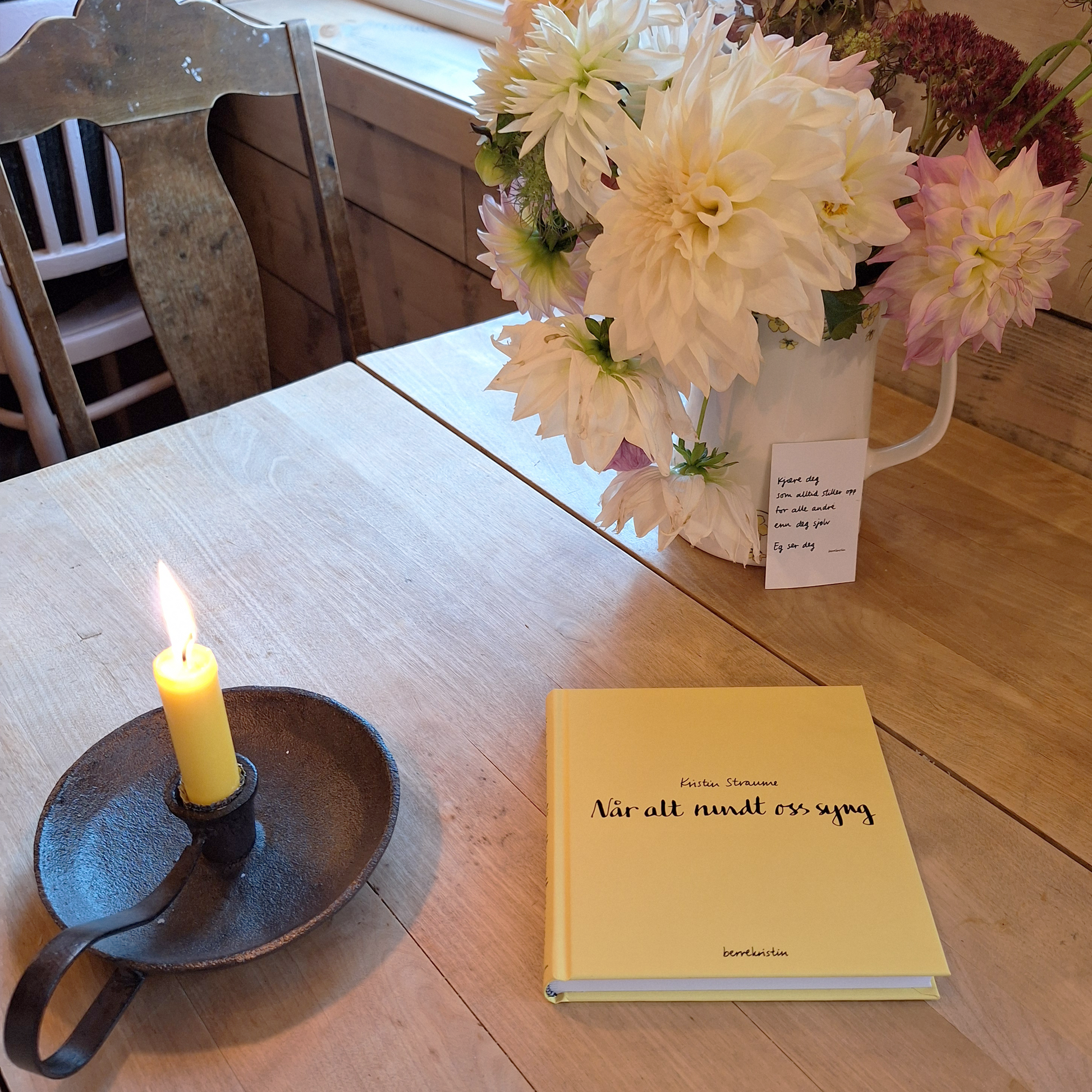 Ei diktbok som passar perfekt som gåve til nokon du bryr deg om, eller som ei stille hand å halda i sjølv. Alle dikta er skrivne for hand av Kristin, noko som gjer utforminga unik og nær. Boka er som dei andre fire diktbøkene kvadratisk designa (15*15 cm), med tjukke ark og ei utside som kjennest mjuk ut når du held ho i hendene.