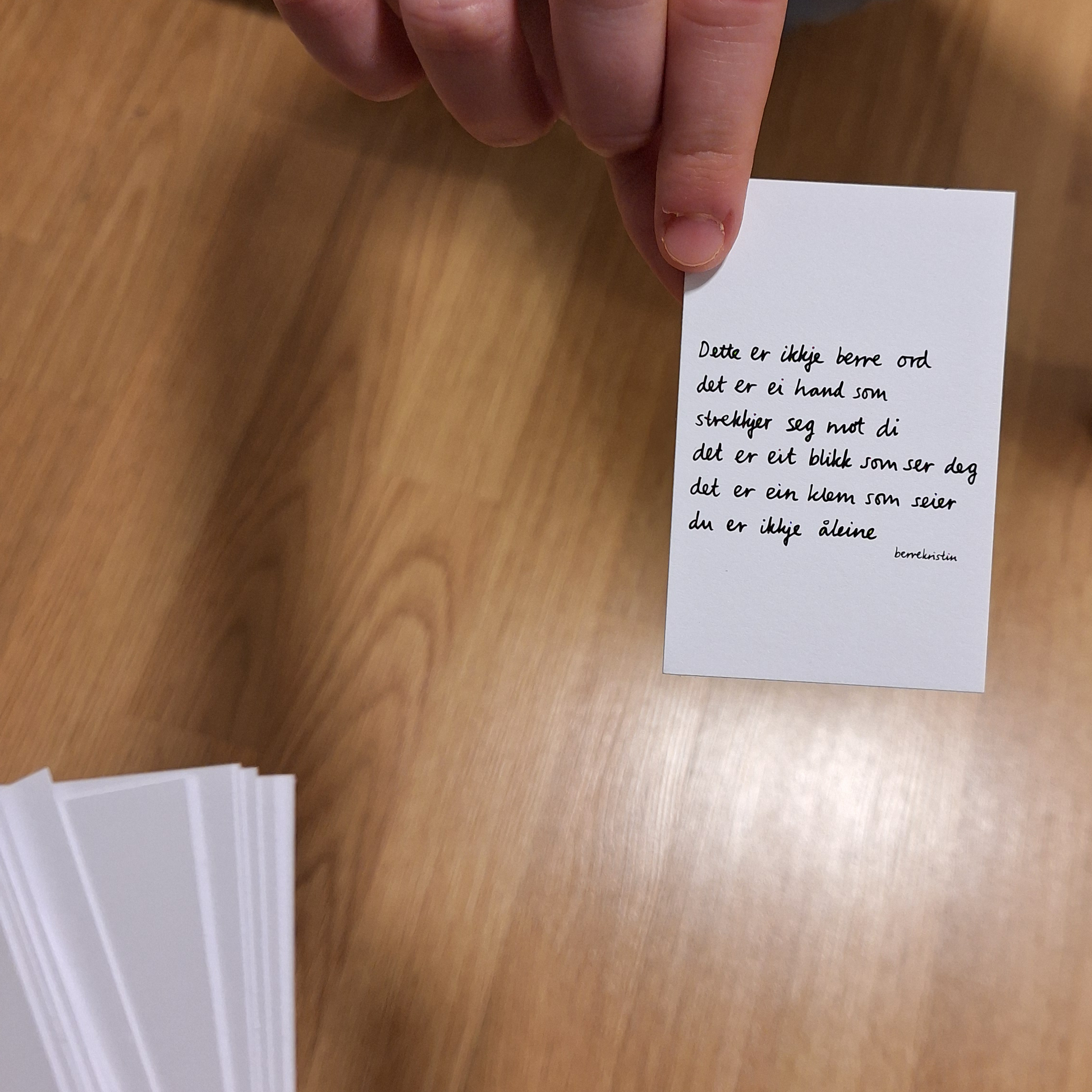 Dikta er i velkjend berrekristin-stil med handskrifta hennar og varme ord. Om du trekkjer eit dikt som ikkje passar til deg, kan du jo tenkja om du kjenner nokon det passar til, og gje vidare til dei? Slik er det ord både til glede og til deling, uansett om du kjøper til deg sjølv eller andre!