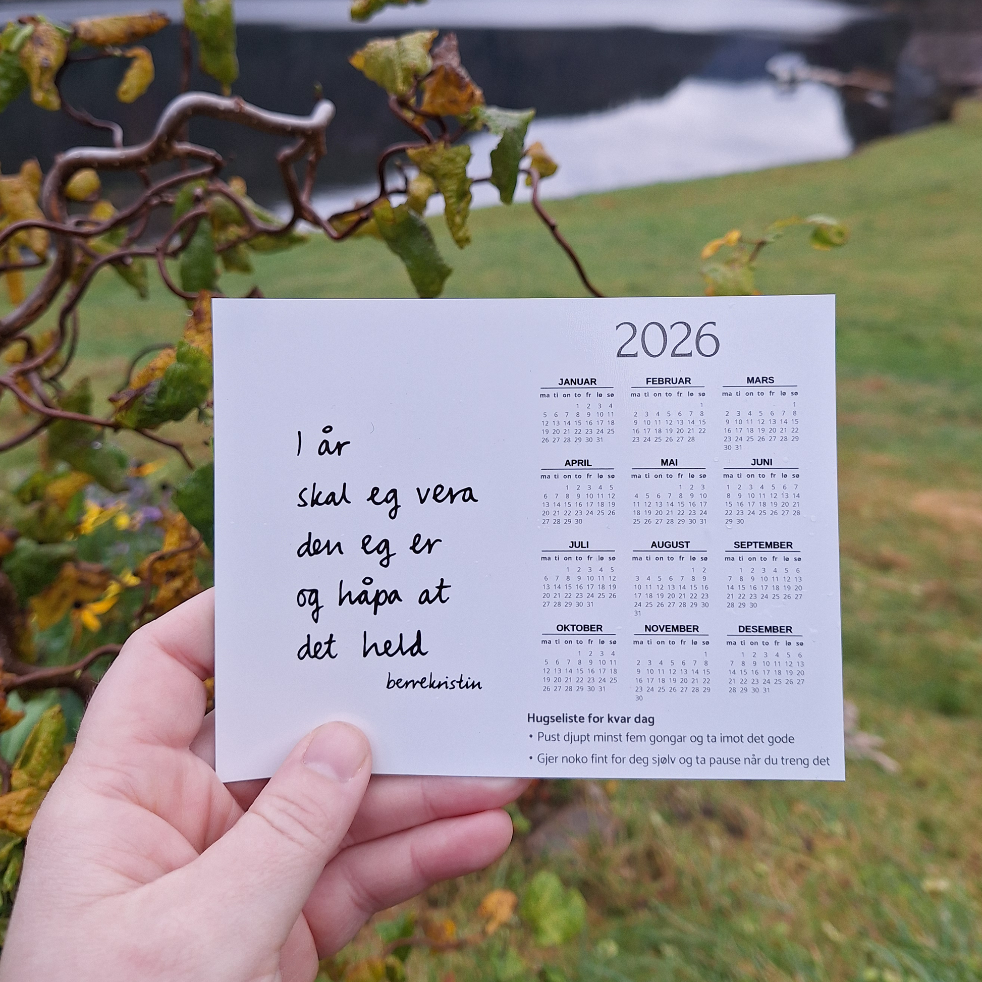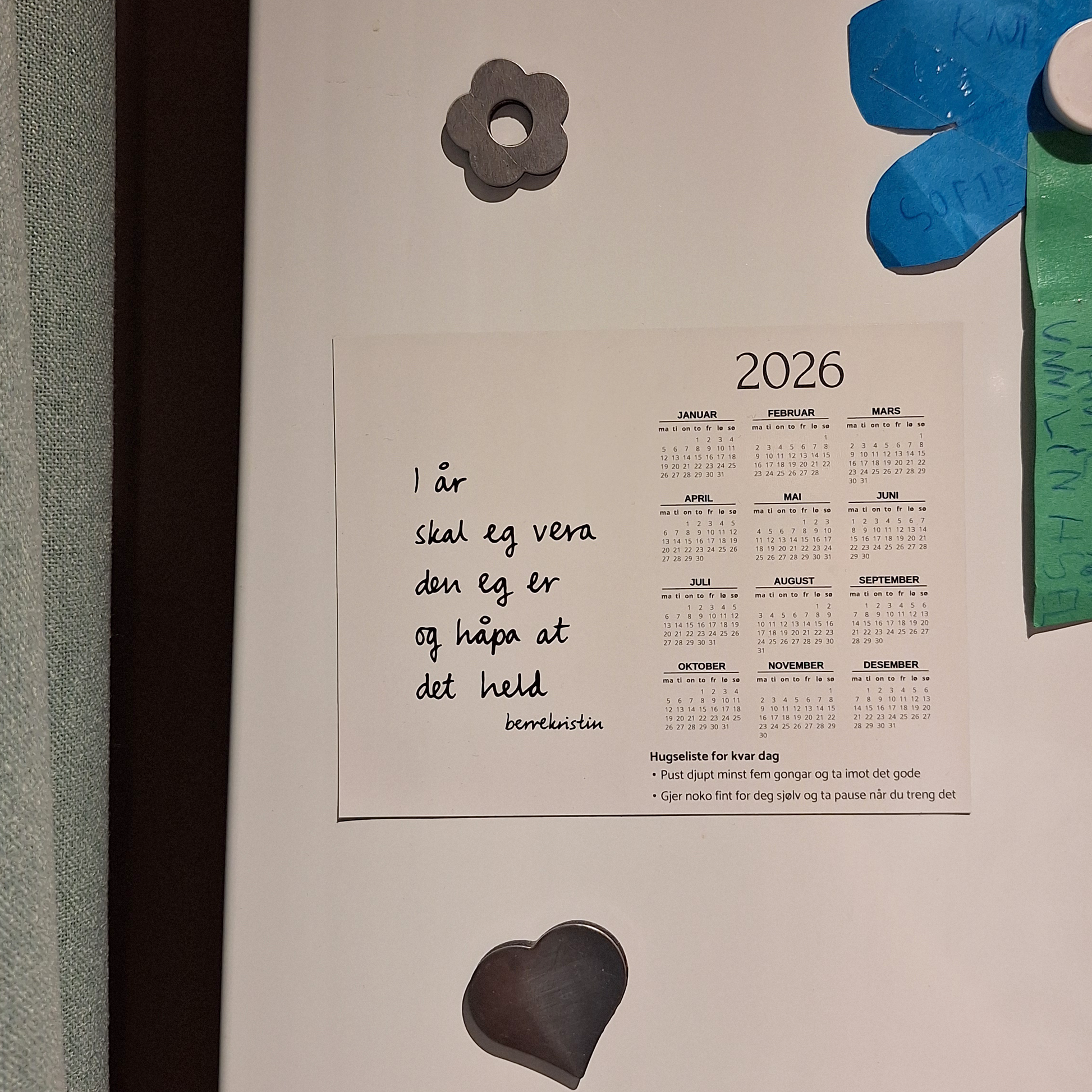 Ein enkel kjøleskapsmagnet i A6-format med årskalender og diktet "I år / skal eg vera / den eg er / og håpa at / det held" av berrekristin, Kristin Straume. Magneten er i mjukt materiale, og nett passeleg som ei fin lita gåve saman med eit kort i ein konvolutt, til nokon du bryr deg om. Fin og praktisk på kjøleskapet som ei enkel oversikt over datoane, og ein påminning om å vera deg sjølv.