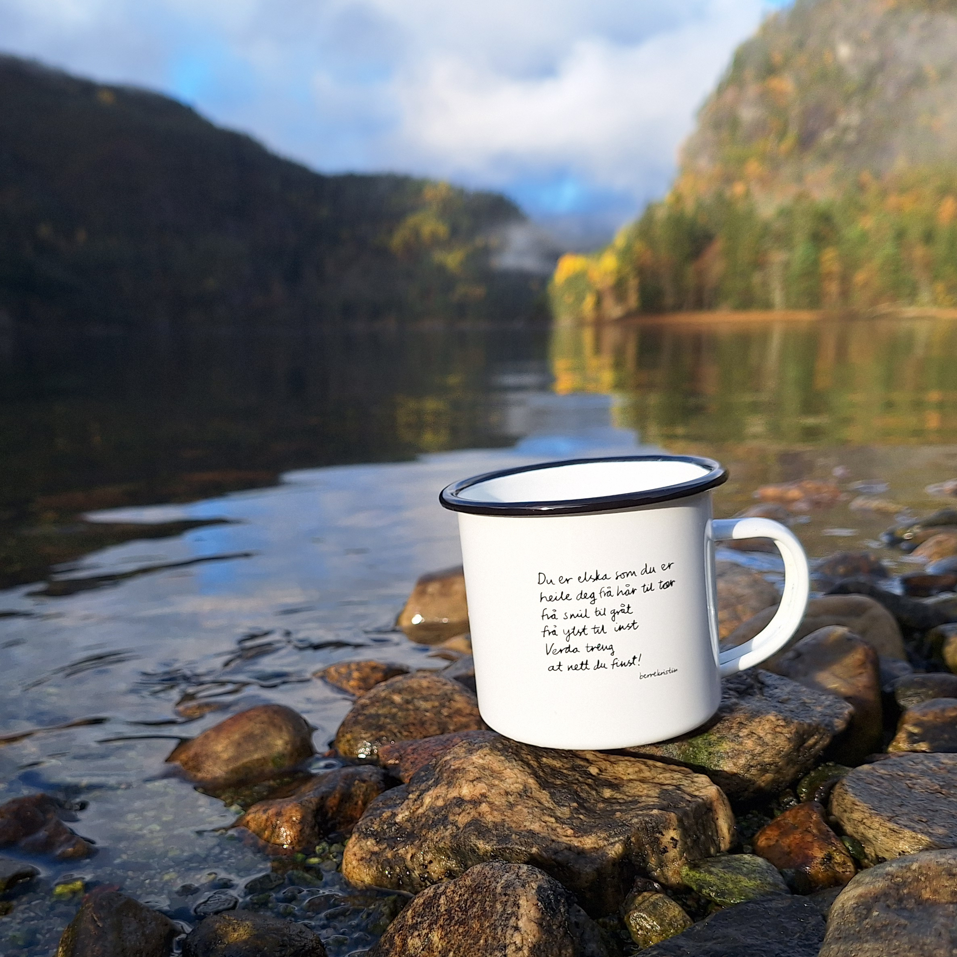 Røff og fin kopp med dikt frå berrekristin, Kristin Straume! Turkopp i emalje, med det viktige diktet «Du er elska som du er, heile deg frå hår til tær, frå smil til gråt, frå ytst til inst. Verda treng at nett du finst» skrive med Kristin si handskrift.