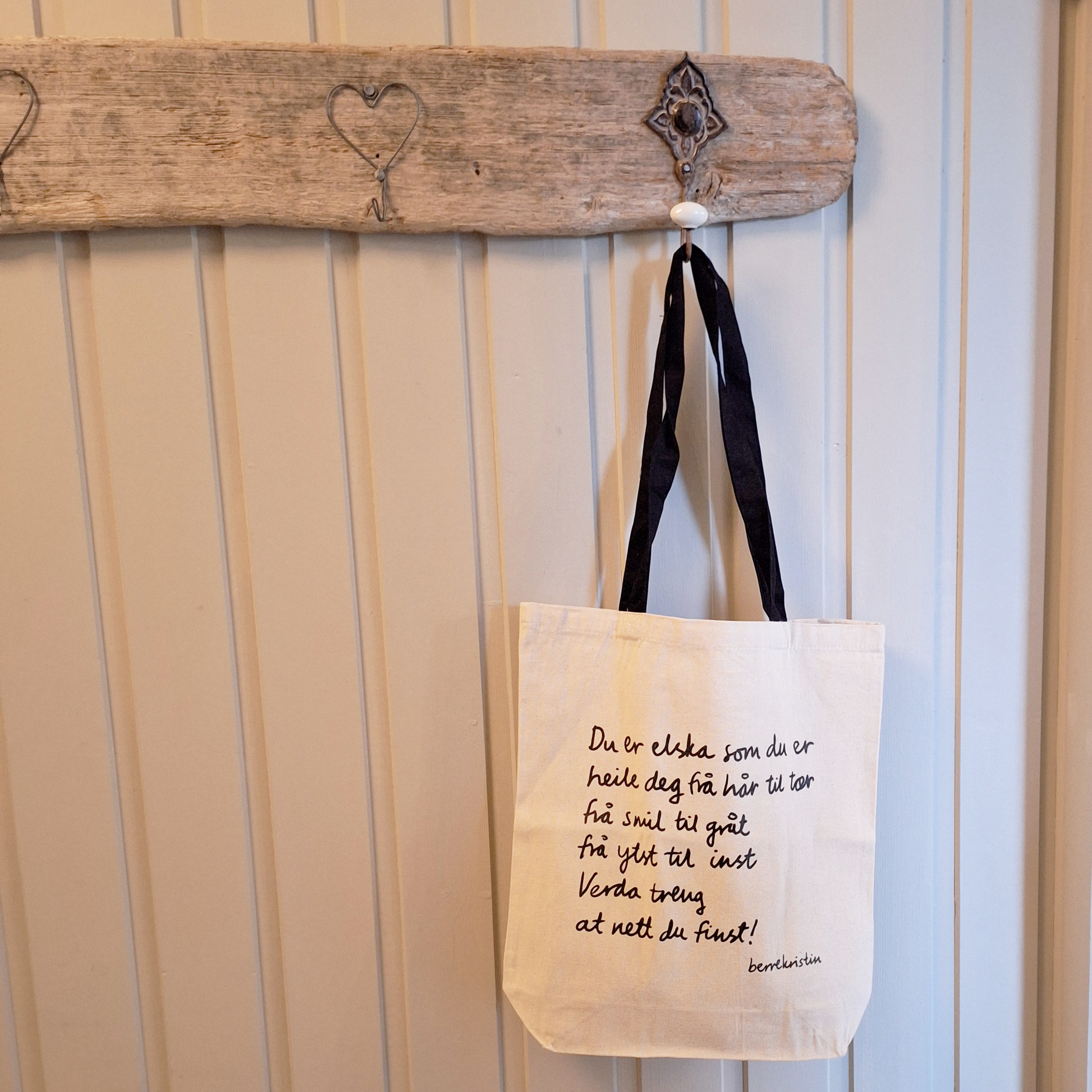 Totebag i naturfarge med svart, breid hank, kraftig kvalitetsstoff av bomull. Diktet er trykt på med silketrykk, som er det sterkaste trykket, og er ein versjon av eit dikt frå den andre, svarte boka til berrekristin, Kristin Straume; «Det kan faktisk gå bra":