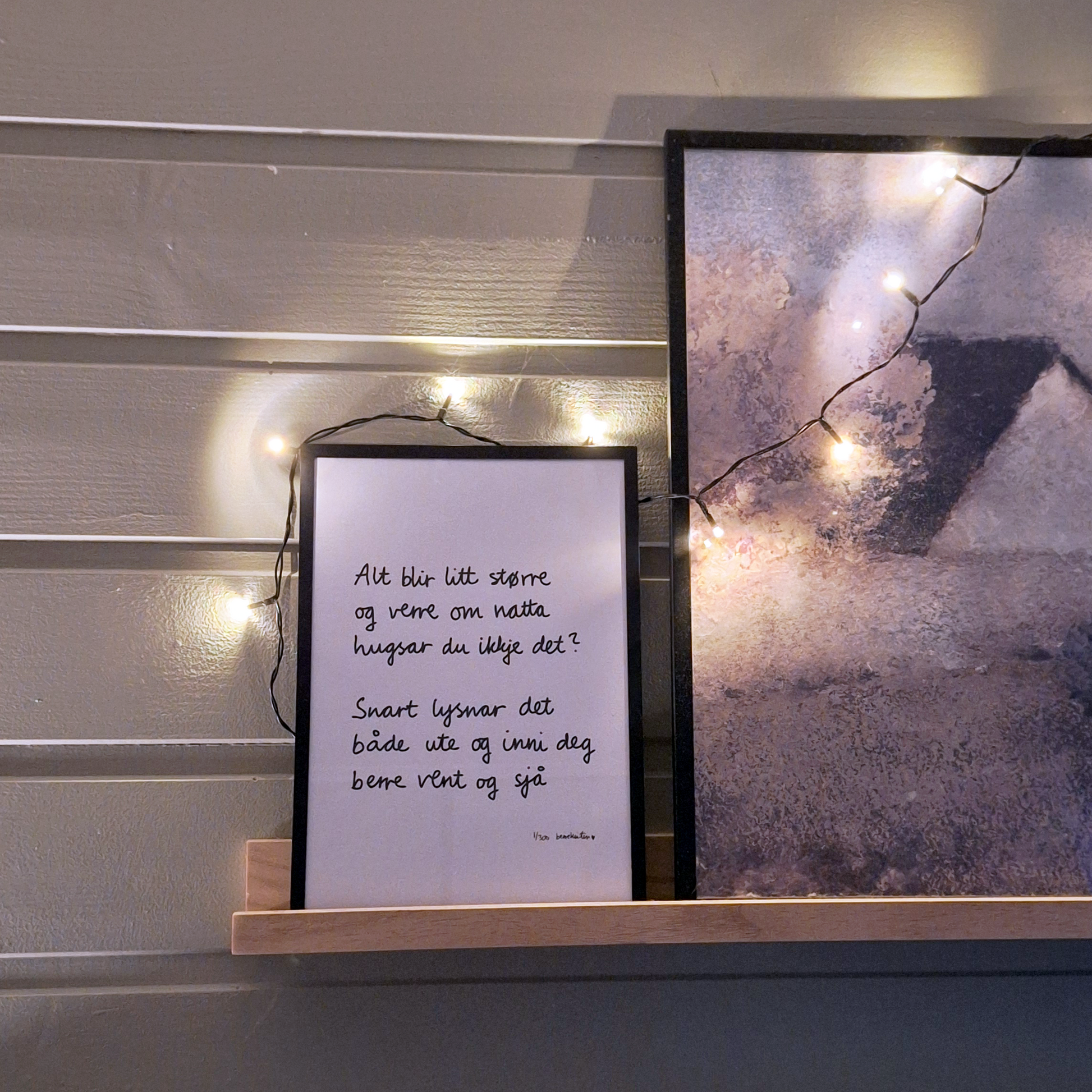 Denne plakaten passar perfekt som ei lysstrime i kvardagen – anten du heng den opp på soveromsveggen, i stova eller på kontoret. Orda gir trøyst, håp og perspektiv – og minner oss på at det mørke ofte kjennest større når natta er på sitt stillaste, men at lyset kjem. Både ute og inni oss.