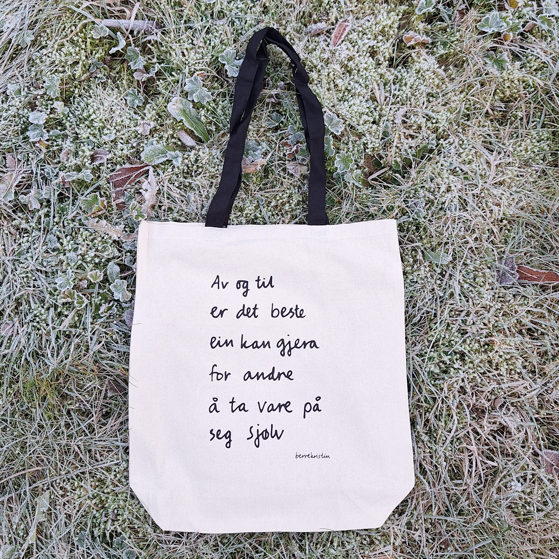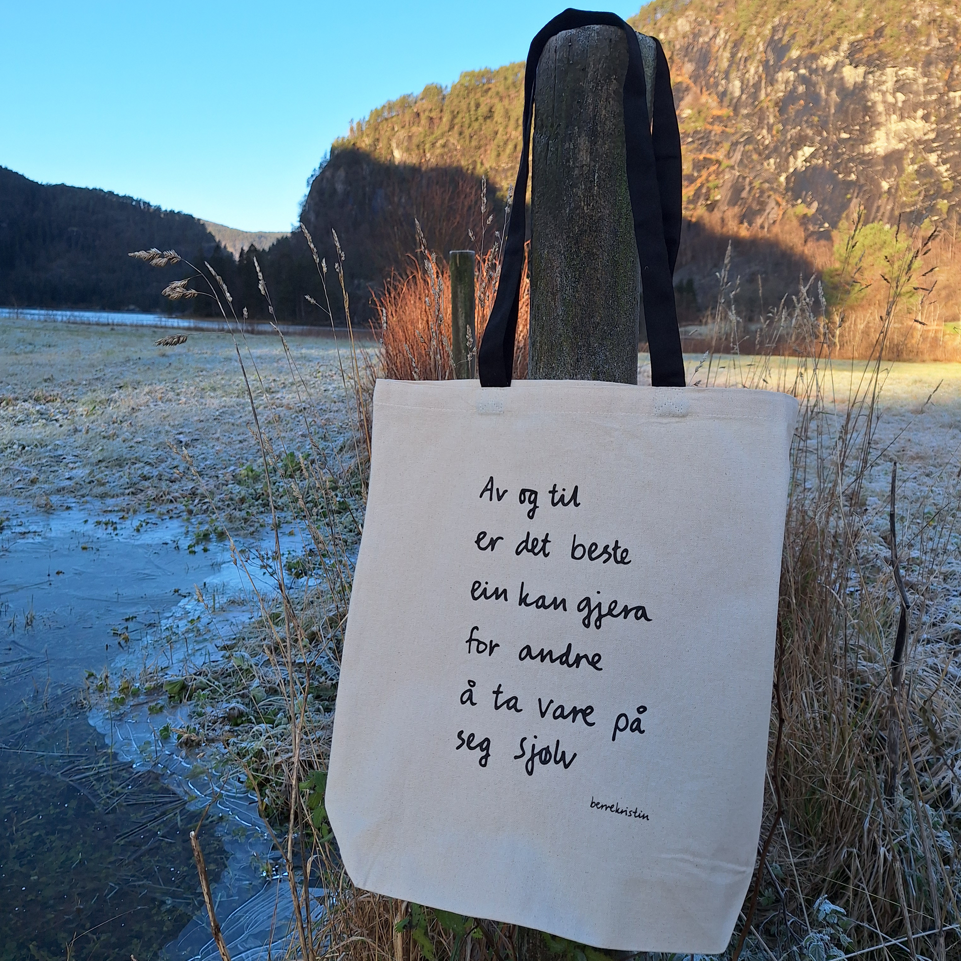 - Handlenettet med teksten "Av og til er det beste ein kan gjera for andre å ta vare på seg sjølv", ei stille påminning om kvile og eigenomsorg i kvardagen.