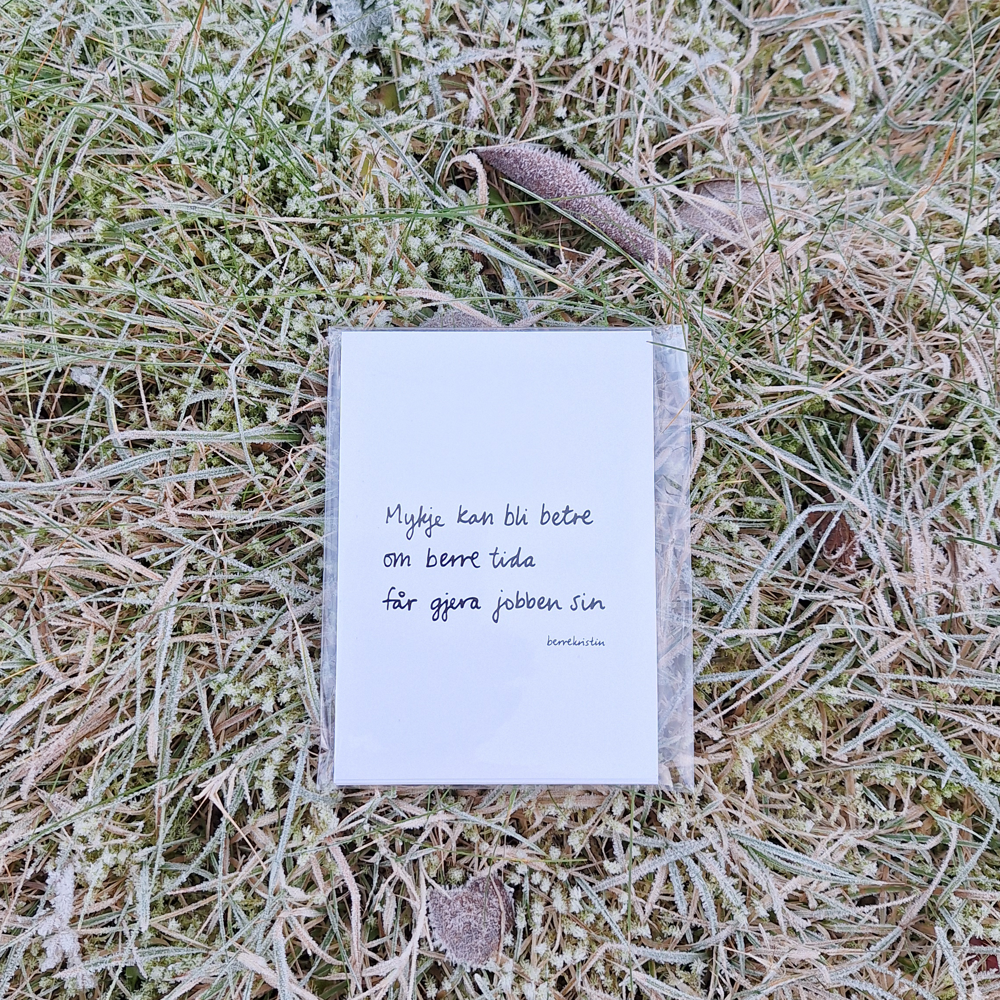 Alle orda er sjølvsagt på nynorsk og handskrivne av berrekristin, i velkjend varm stil. Pakka vert pakka og sendt av Kristin sjølv, frå lageret i huset hennar ved ein vestlandsfjord.